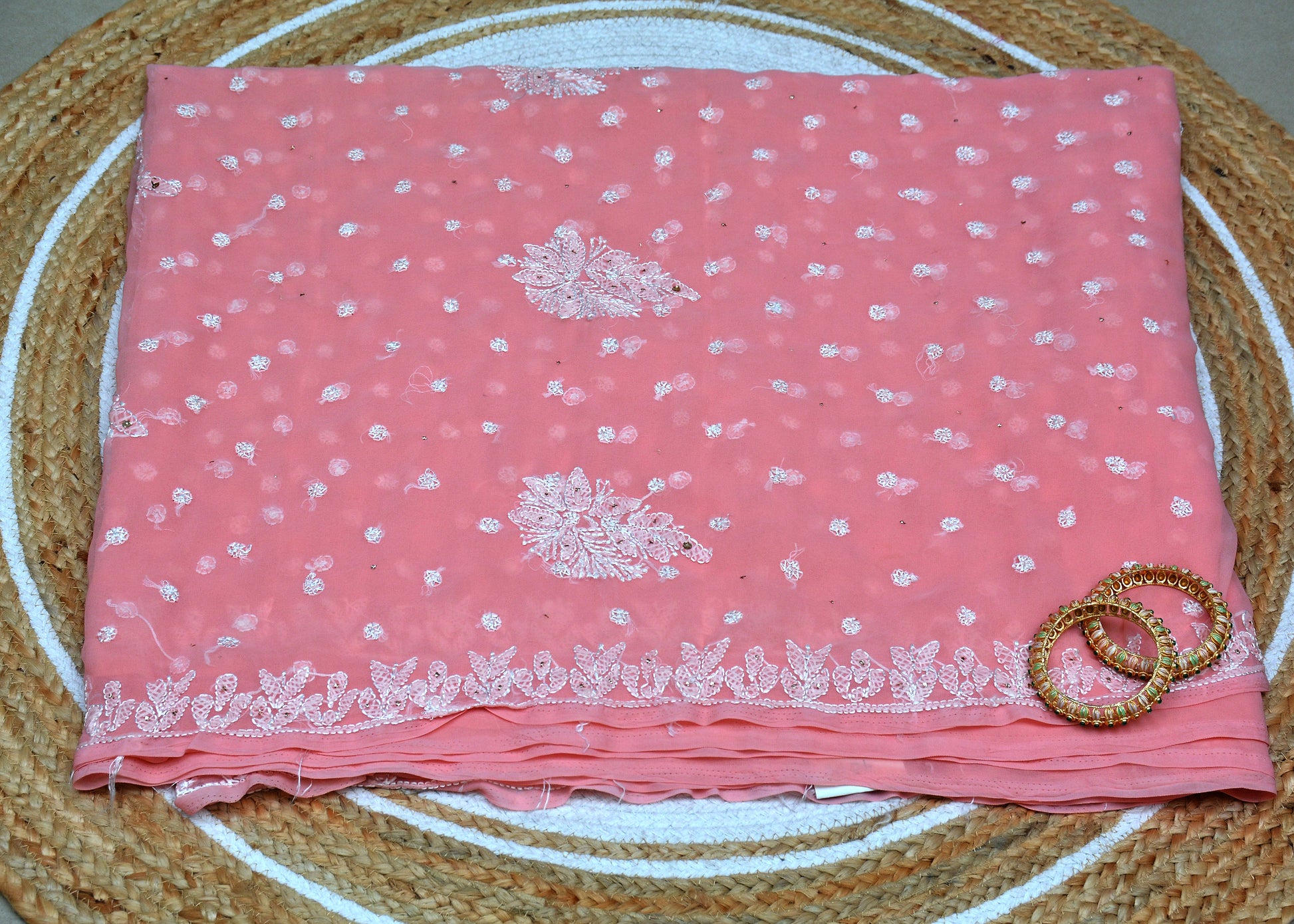 Hand Embroidered Pure Georgette Lucknowi Saree