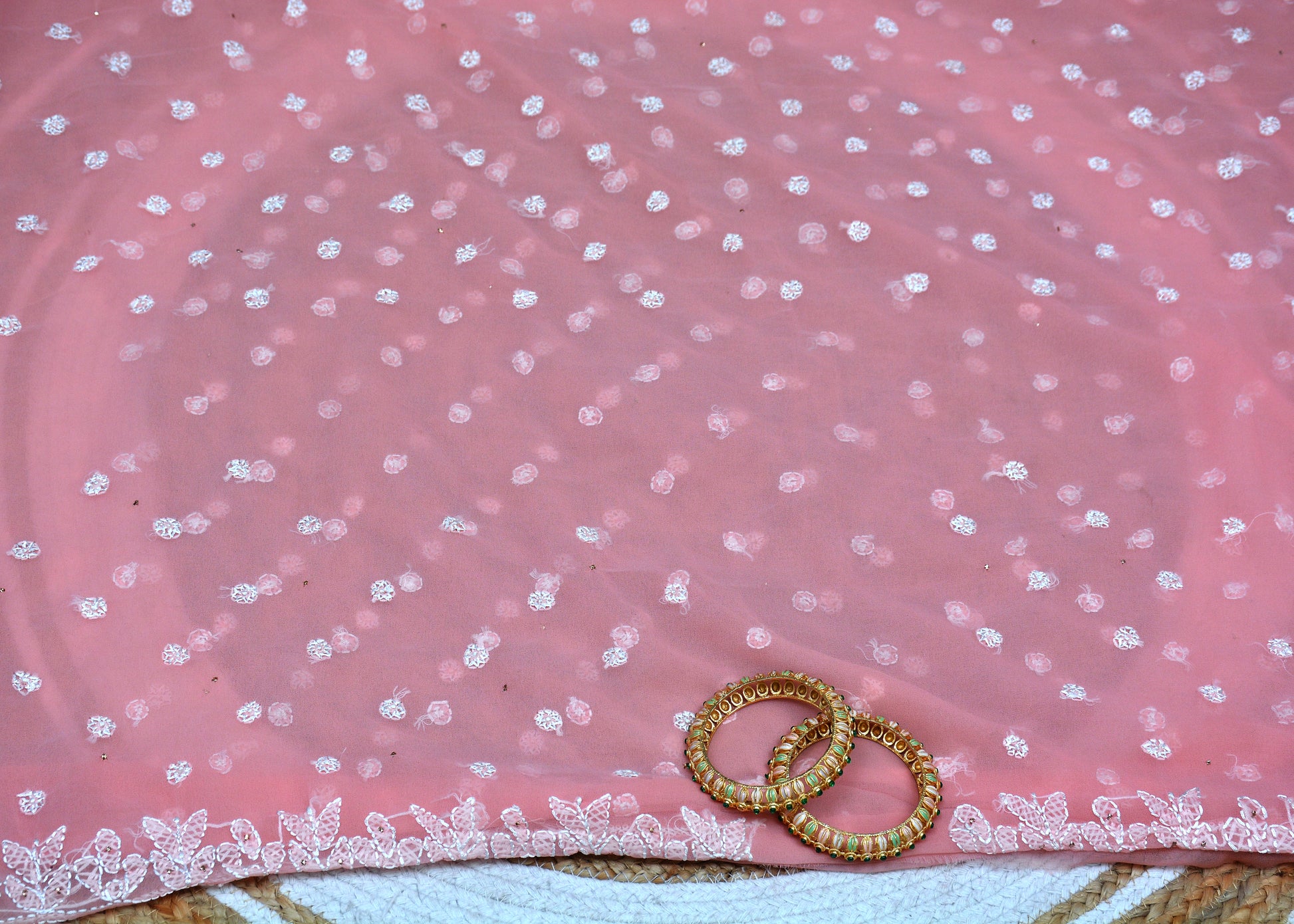 Experience elegance with this Hand Embroidered Pure Georgette pink Lucknowi Saree, featuring intricate hand-embroidered floral motifs across the fabric and a delicate floral border. The richly embroidered pallu enhances its traditional appeal, while the matching blouse with butas and detailed border completes the ensemble. Crafted for comfort and ease, this saree drapes beautifully, making it perfect for any occasion that calls for grace and sophistication.