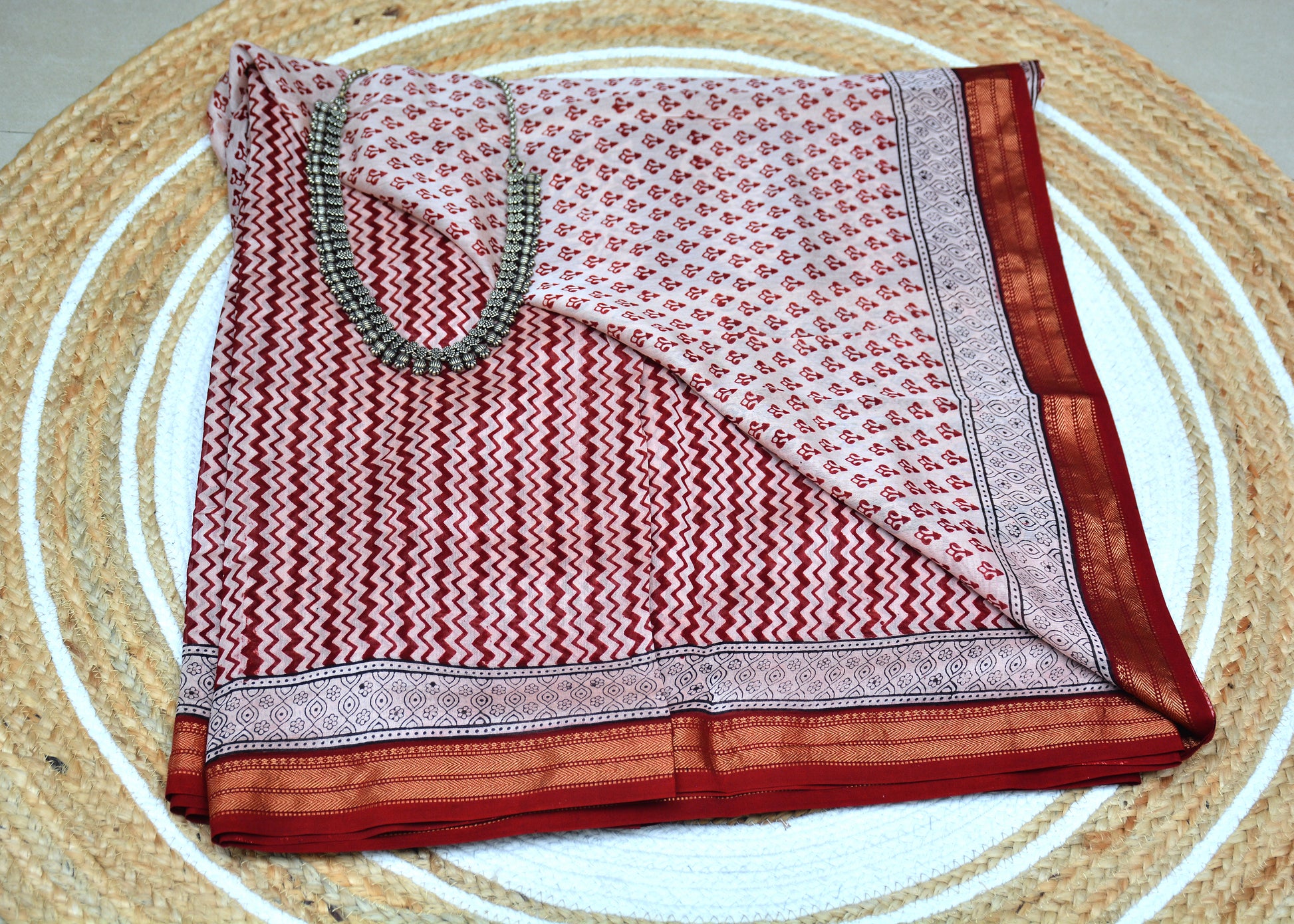 Crafted from handloom silk cotton, this Bageshwari saree—a distinguished variant of the Maheshwari style—features an elegant beige hue adorned with an all-over zigzag pattern. It is enhanced by a striking maroon zari border and a beautifully handblock printed pallu, which together showcase meticulous craftsmanship. Accompanied by a contrasting printed blouse, this lightweight saree offers exceptional comfort and refined sophistication, making it ideal for discerning wearers seeking both tradition and ease.