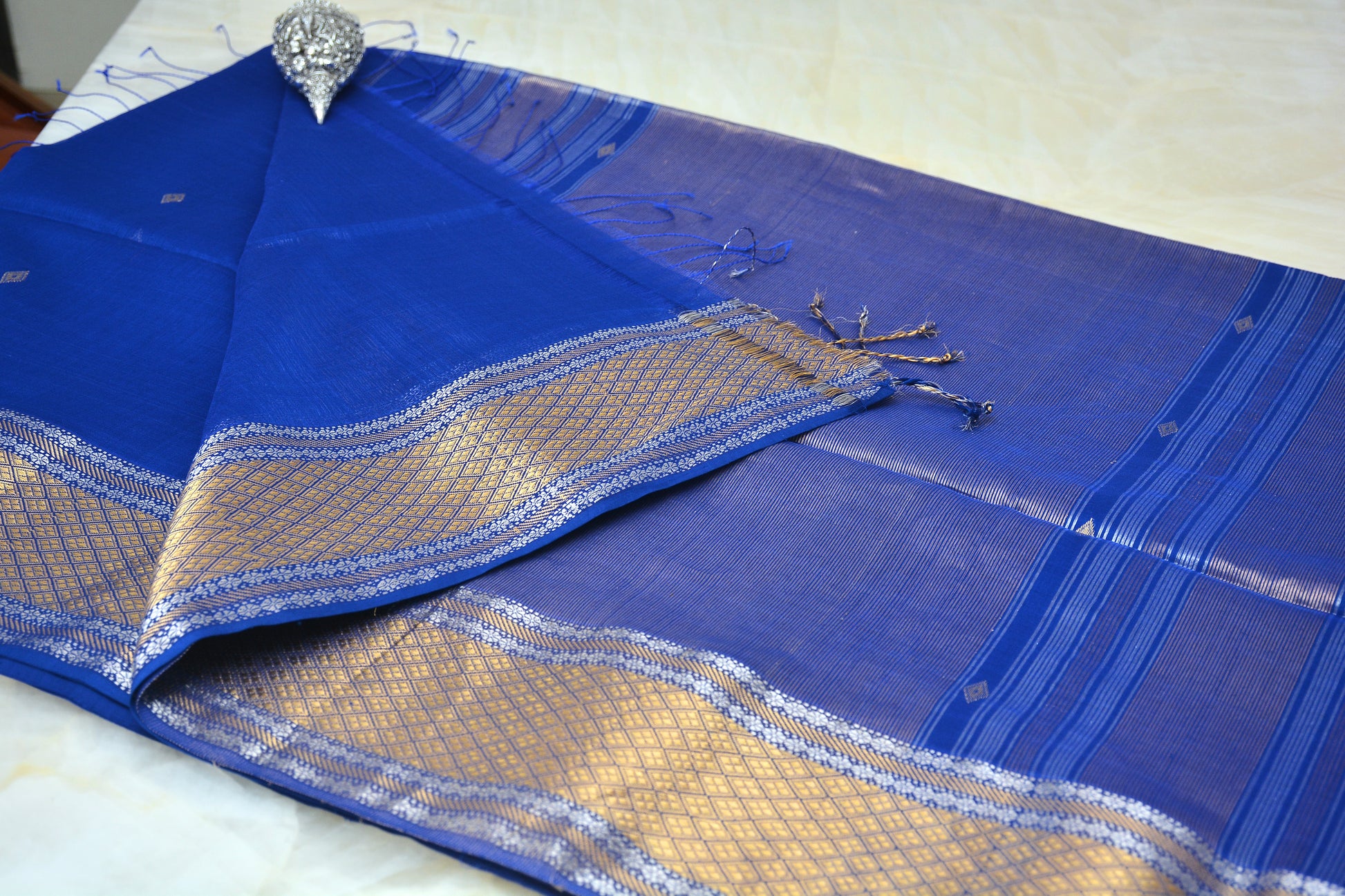 Expertly handwoven, the Maheshwari Handloom Saree boasts a rich royal blue color and intricate big border and small butas. Made from luxurious cotton silk, this saree features a luxurious tissue pallu and comes with a running blouse. Perfect for special occasions.