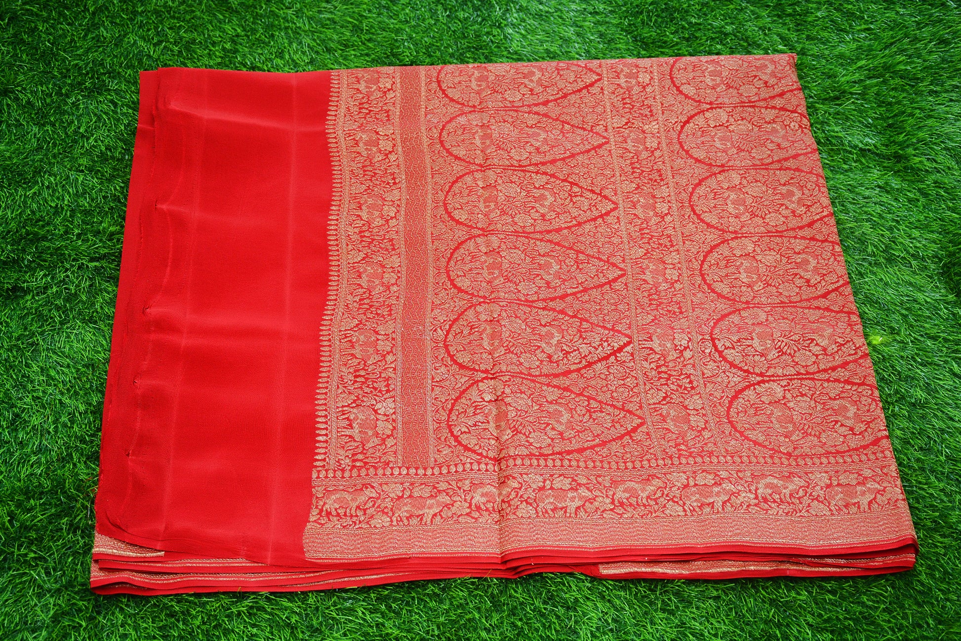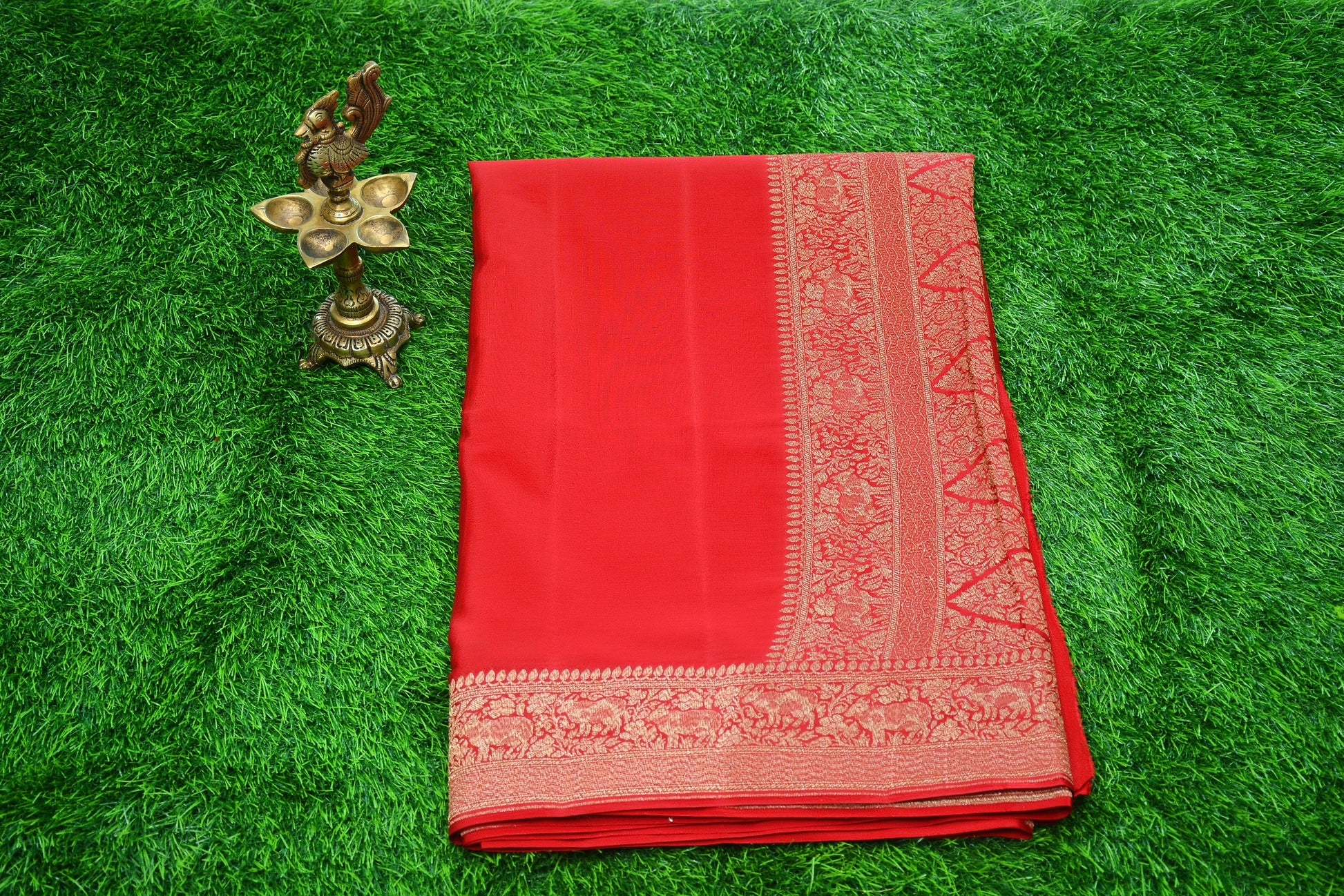 This handwoven bright red pure crepe silk saree is both lightweight and traditional. Its plain body is complemented by a stunning pichwai border in antique zari, while the accompanying blouse features a beautiful zari jaal design. Elevate your style with this Pure Banarasi Crepe Silk Saree.