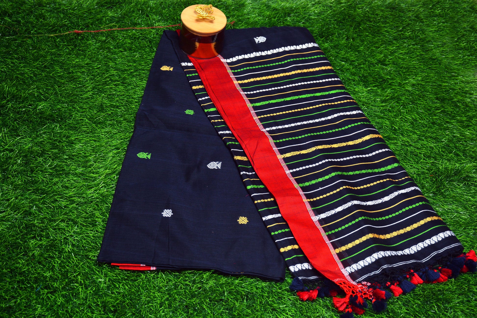 This pure cotton handloom saree in a rich navy blue features a striking red border that enhances its elegance. Adorned with delicate thread butas in yellow, green, and white scattered throughout, it showcases intricate craftsmanship. The saree’s pallu is beautifully detailed with fine thread work, adding a refined touch. It comes with a matching running blouse, making it a complete ensemble perfect for traditional occasions or everyday grace.