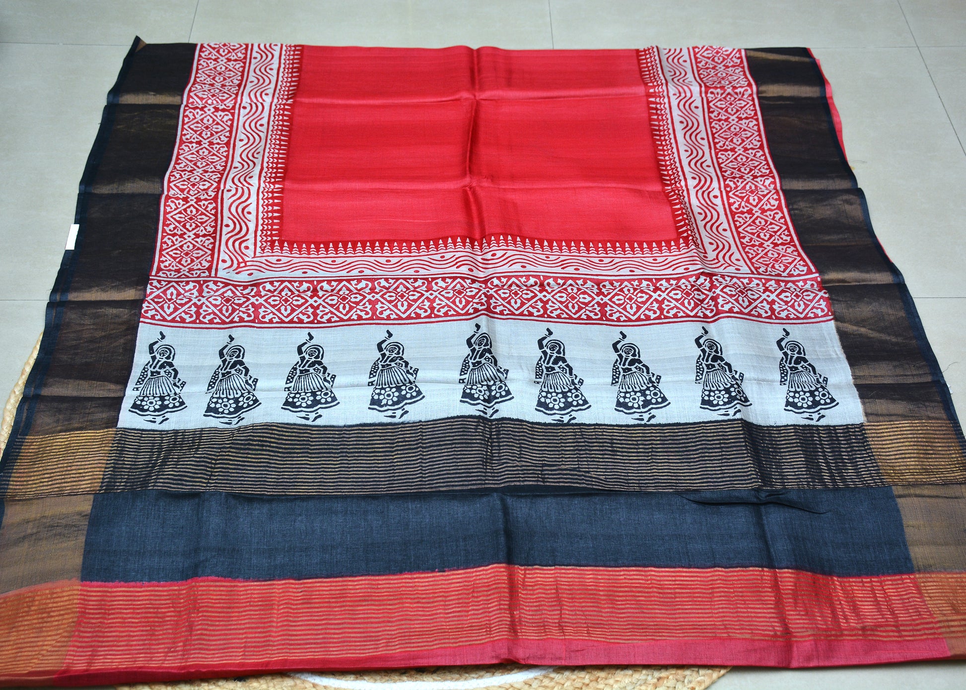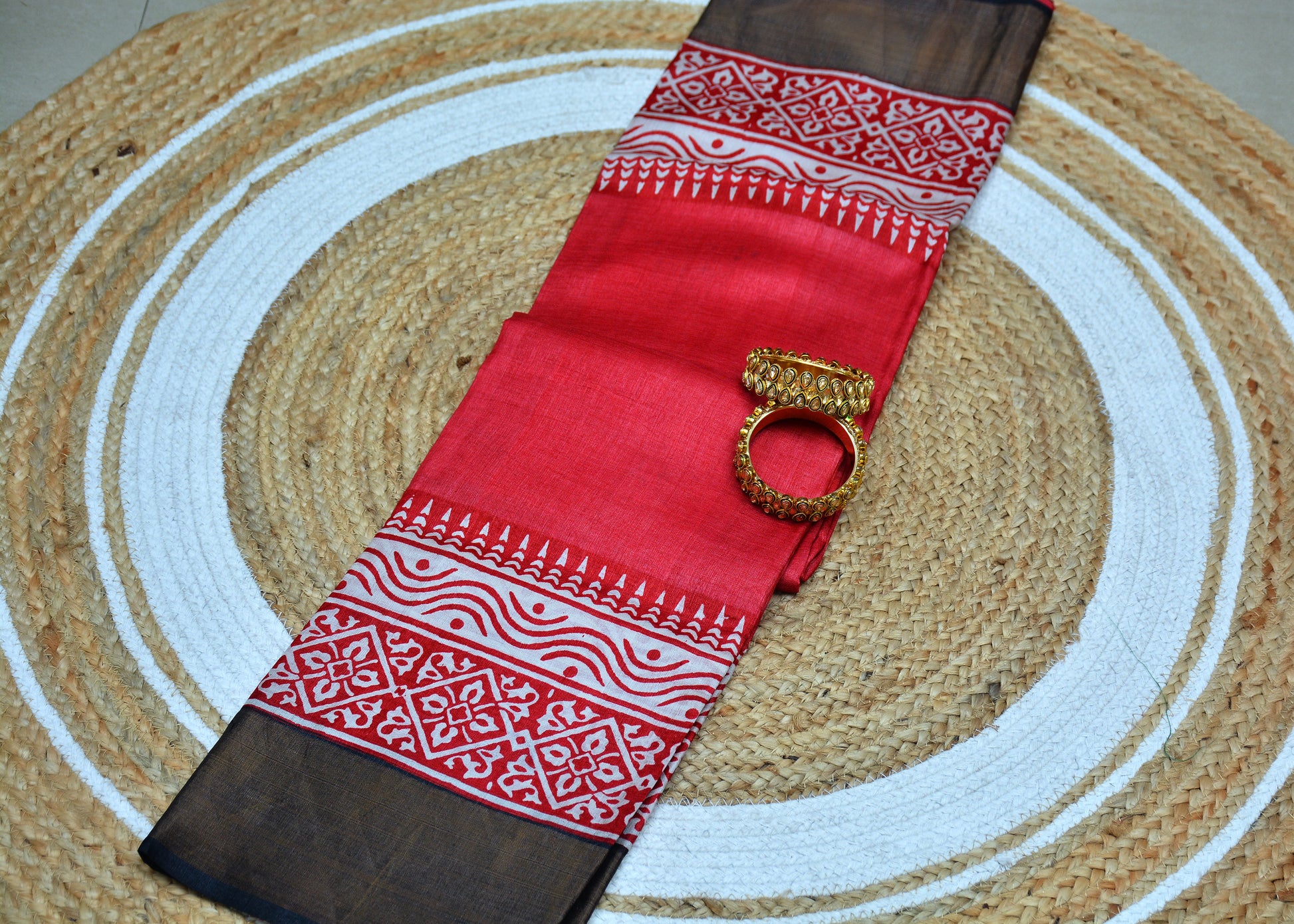 This pure Gachi Tussar silk saree in a subtle reddish pink hue features intricate handblock prints and zari borders along the edges and pallu, showcasing exquisite craftsmanship. It comes with a contrasting dark grey blouse piece adorned with a matching zari border, adding a dignified and timeless elegance. Suitable for formal occasions, this saree is best maintained through dry cleaning to preserve its rich texture and vibrant detailing.
