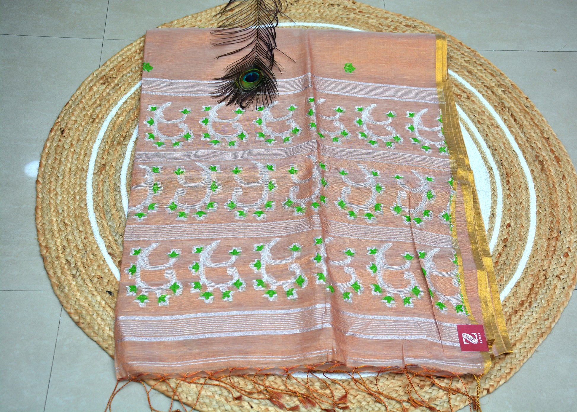 This exquisite chikoo colour tissue linen saree with zari and thread butas, showcases the finesse of pure handloom craftsmanship. Enhanced with a delicate zari border and and adorned with an elegant green thread design on the pallu, it brings subtle sophistication to any ensemble. Lightweight with a natural sheen, it drapes effortlessly, ensuring comfort and grace throughout special occasions. Included with a matching running blouse, this saree also pairs beautifully with contrasting blouses for versatile styling choices. Perfect for those who appreciate timeless elegance and refined texture in traditional attire.