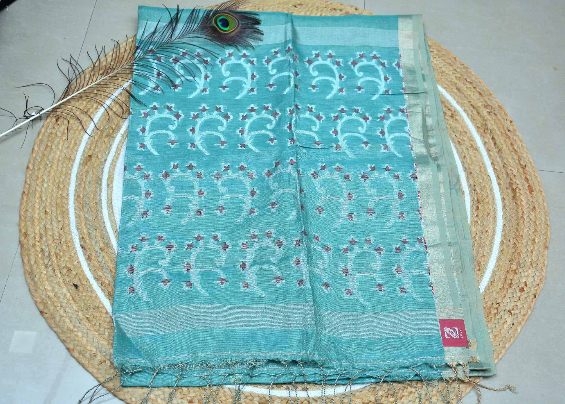 This elegant tissue linen saree in a serene turquoise shade showcases exquisite zari borders and delicate butas throughout. Featuring a rich floral pallu crafted in fine threadwork, the saree combines lightweight comfort with traditional craftsmanship, making it ideal for small functions and gatherings. Its breathable fabric and sophisticated design ensure you look graceful while enjoying ease of wear.